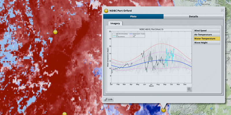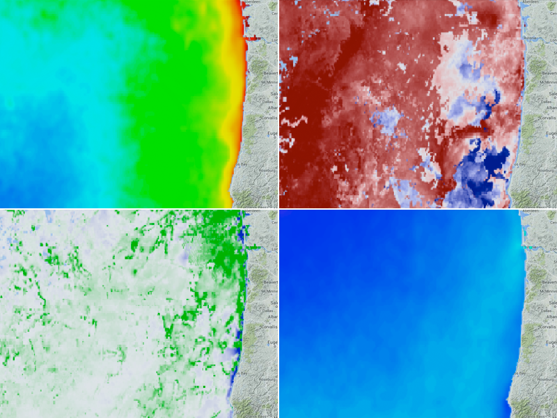 - Ocean overlays depicting monthly averages of chlorophyll abundance and sea surface temperatures derived from MODIS satellite data, as well as NCEP North American Regional Reanalysis (NARR) 10-meter winds and mean sea level anomalies derived from AVISO satellite altimetry data. The latter show deviations in observed mean sea levels relative to the long-term mean.